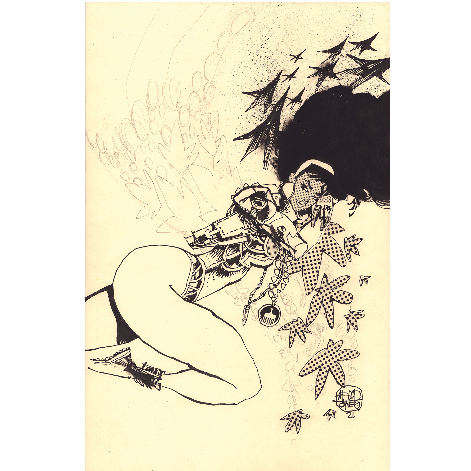 Pen & Ink with zip-a-tone and colored pencil on ivory paper. 11×17.
