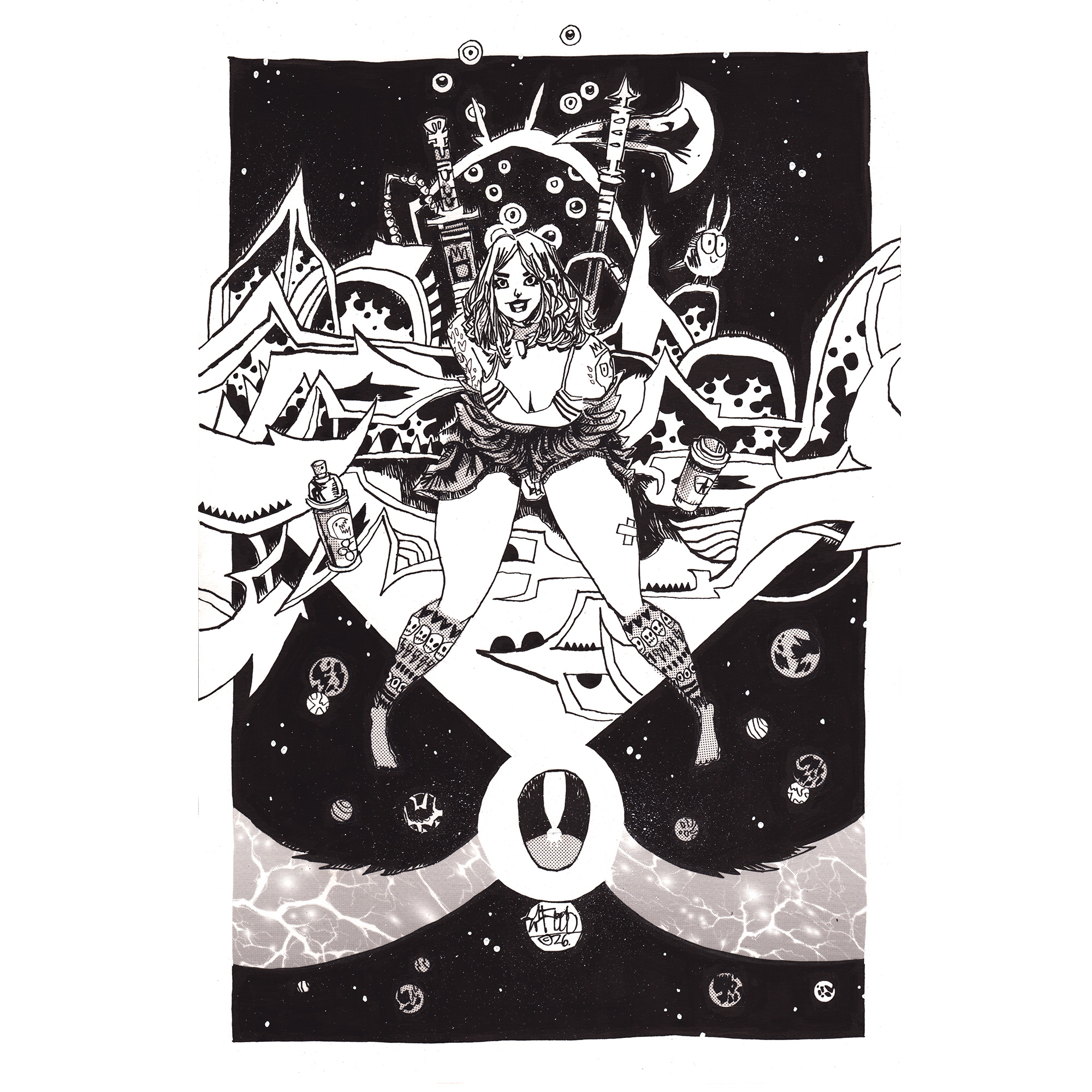 Pen and ink w zip-a-tone on Bristol. 11×17.